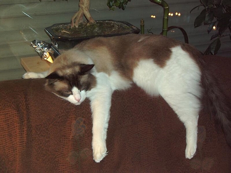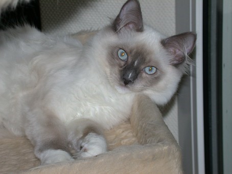 Romantico`s Dream oder Paul, wie wir ihn nennen, war unser erster Deckkater. Charakterlich ist Paul ein typischer Ragdollkater - wie man auf dem Photo unschwer erkennt; er ist unglaublich anhänglich und immer dabei, wenn irgendwo etwas geschieht. Stets sucht er Nähe, möchte schmusen oder unter seinem Bauch gekrault werden. Waren wir einige Zeit außer Hause, begrüßt er uns mit unentwegtem Köpfchenreiben und lautem Schnurren. Mit seinen langen weißen Beinen ist nichts vor ihm sicher, er ist ein wahrer Athlet. Um unser Zuchtziel weiter verfolgen zu können, entschlossen wir uns im Herbst 2003 schweren Herzens unser Paulchen kastrieren zu lassen. Wir waren fest entschlossen, ihn bei uns zu behalten, aber leider kam er mit zunehmender Reife unseres Micios mit seiner neuen Rolle im Rudel nicht zu Recht. So fanden wir die für alle Beteiligten wunderbare Lösung, Paulchen zu Freunden in unmittelbarer Nähe von unserem Wohnort zu geben, wo er nun mit fünf weiteren Kastraten (drei Perserdamen, einer BKH-Dame sowie einem BKH-Kater) ein wirklich unbeschwertes Leben in einer Großfamilie führt. Er wird von allen geliebt und verwöhnt und wir können ihn jederzeit besuchen. Als gutes Zeichen für die Zukunft unserer kleinen Zucht haben wir uns entschieden, seine Tochter Chelsea aus dem letzten Wurf mit Amenità bei uns zu behalten; sie wird seine Linie in unserer Zucht weiter vererben.